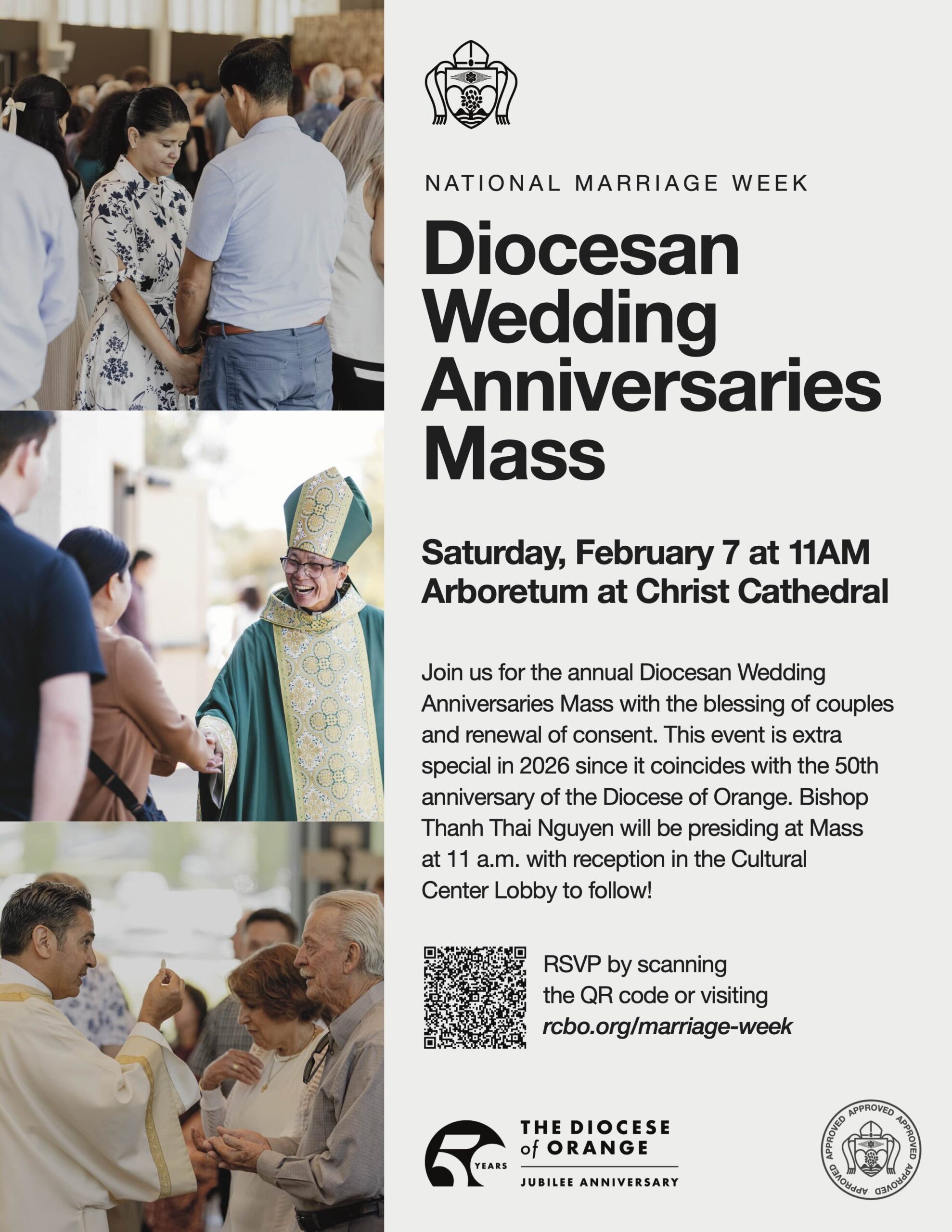 Join us for the annual Diocesan Wedding Anniversaries Mass with the blessing of couples and renewal of consent. This event is extra special in 2026 since it coincides with the 50th anniversary of the Diocese of Orange. Bishop Thanh Thai Nguyen will be presiding at Mass at 11 a.m. with reception in the Cultural Center Lobby to follow!